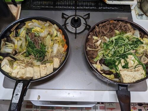 去年の大晦日に引き続きすき焼きを作った。今回は沢山食べたいとのニーズがあって二鍋作る。大量の材料を調理するのもそれを置く場所を準備するのもまた容器を準備するのも大変で、量を作る難しさを実感、逆にこれが一人や二人分ならばもっと楽になりそう。…